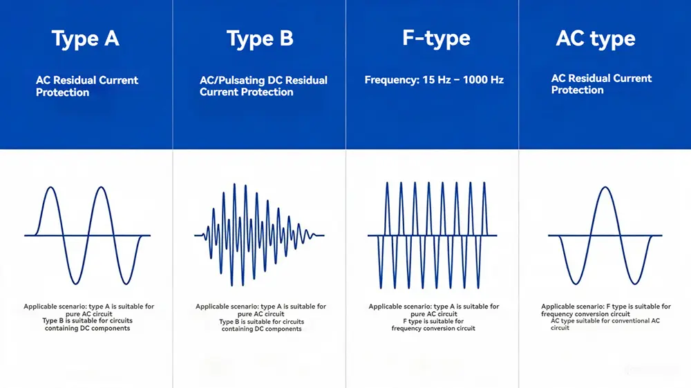 | نوع جریان باقیمانده | نوع AC | جریان باقیمانده AC سینوسی؛ برای روشنایی عمومی، پریزها و بارهای مقاومتی. |